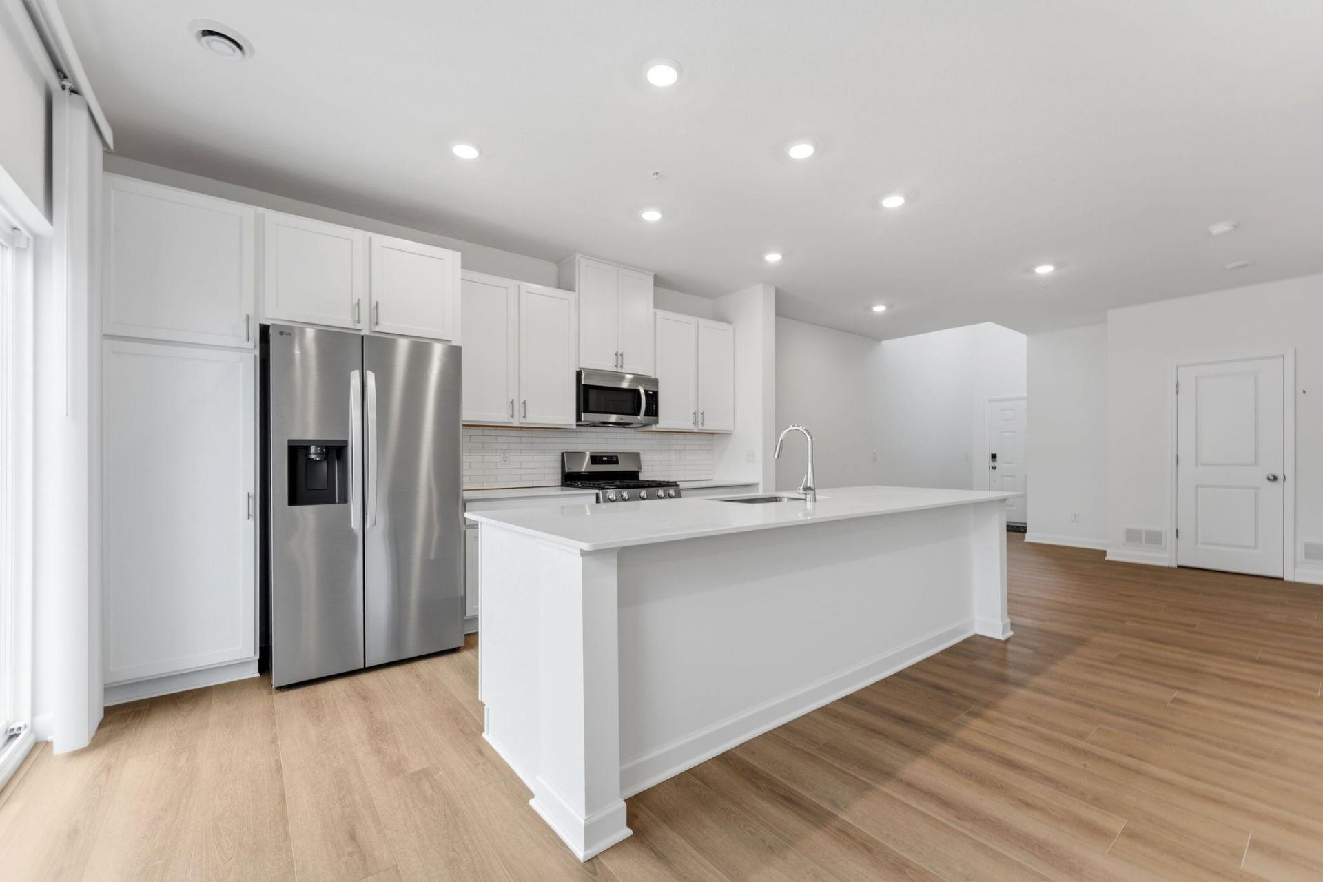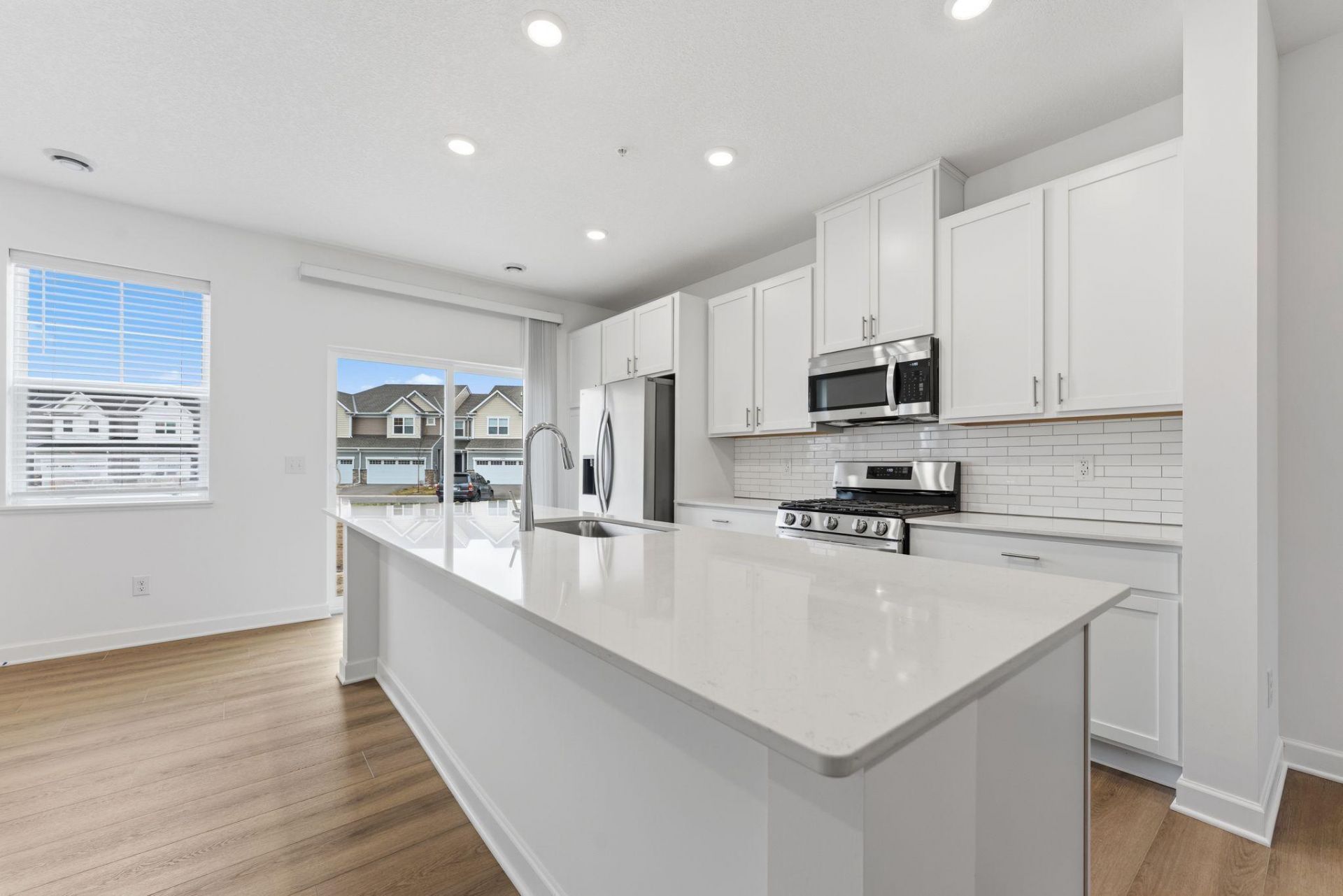 Move-in ready! Step inside this inviting two-story townhome and discover a thoughtfully designed layout perfect for both relaxing and entertaining. The main level welcomes you with a spacious family room, a dedicated dining area for memorable gatherings and a modern kitchen featuring LG® stainless steel appliances, quartz countertops, a tile backsplash and sleek cabinetry with soft-close doors. Enjoy the convenience of a stainless steel undermount sink and a Moen® high-arc pullout faucet, making meal prep and cleanup a breeze. Upstairs, three restful bedrooms await, including a generous owner's suite with a glass-enclosed shower, oversized shower head and Silestone® countertops. Throughout the home, you'll find plush carpeting in the bedrooms, luxury vinyl plank flooring in the living areas and professionally designed interior color packages. Energy-efficient features like Low-E dual pane windows, R-49 attic insulation and a 92% efficient furnace help keep comfort in and costs down. The fully drywalled attached 2-car garage with an insulated door, opener and exterior GFCI outlets adds even more convenience. Homes with this level of style and functionality are in high demand?don't miss your chance to make it yours!